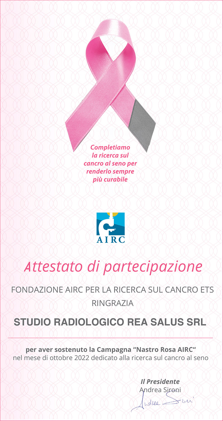 La Fondazione AIRC ha attestato l’impegno dello studio radiologico Rea Salus, anche per l’anno 2022, per aver sostenuto la campagna "Nastro Rosa AIRC".